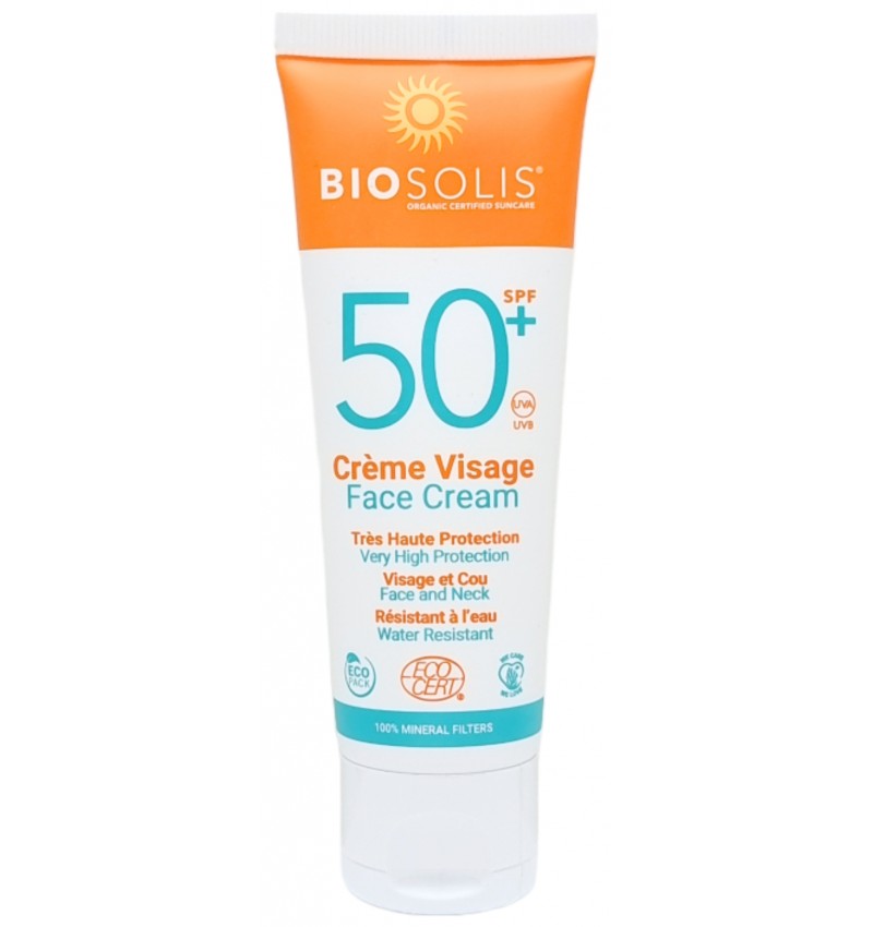 Îmbogățită cu Aloe vera și uleiuri pe bază de plante, crema de față cu SPF50+ oferă o protecție naturală foarte ridicată împotriva razelor UVA/UVB. Filtrele sale sunt 100% minerale. O formulă delicată, fără parfum, care se întinde ușor. Formula sa este uscată și nu se lipsește de piele.Nu conține parfum adăugat.Certificată vegană și ecologică.